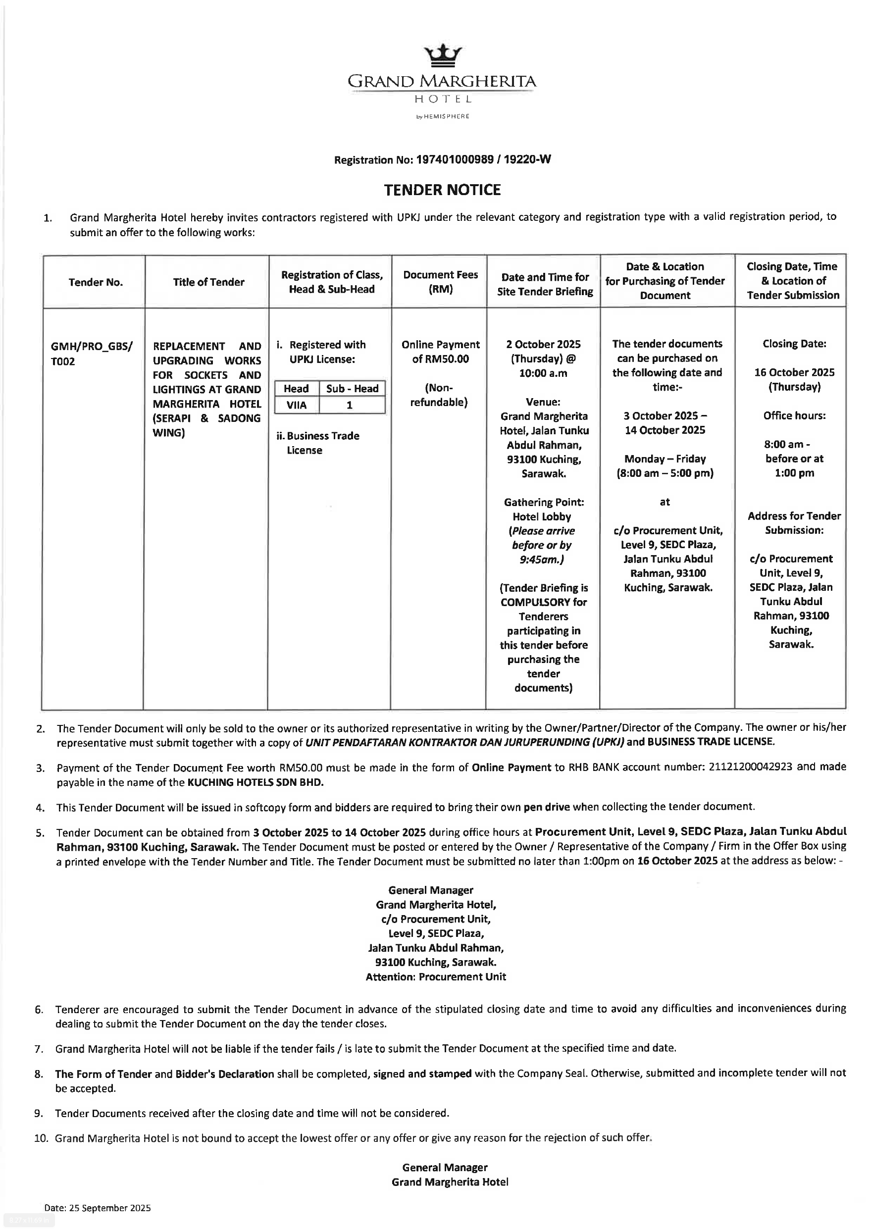 GMH/PRO_GBS/T002 – Replacement and Upgrading Works For Sockets and Lightings at Grand Margherita Hotel (Serapi & Sadong Wing)