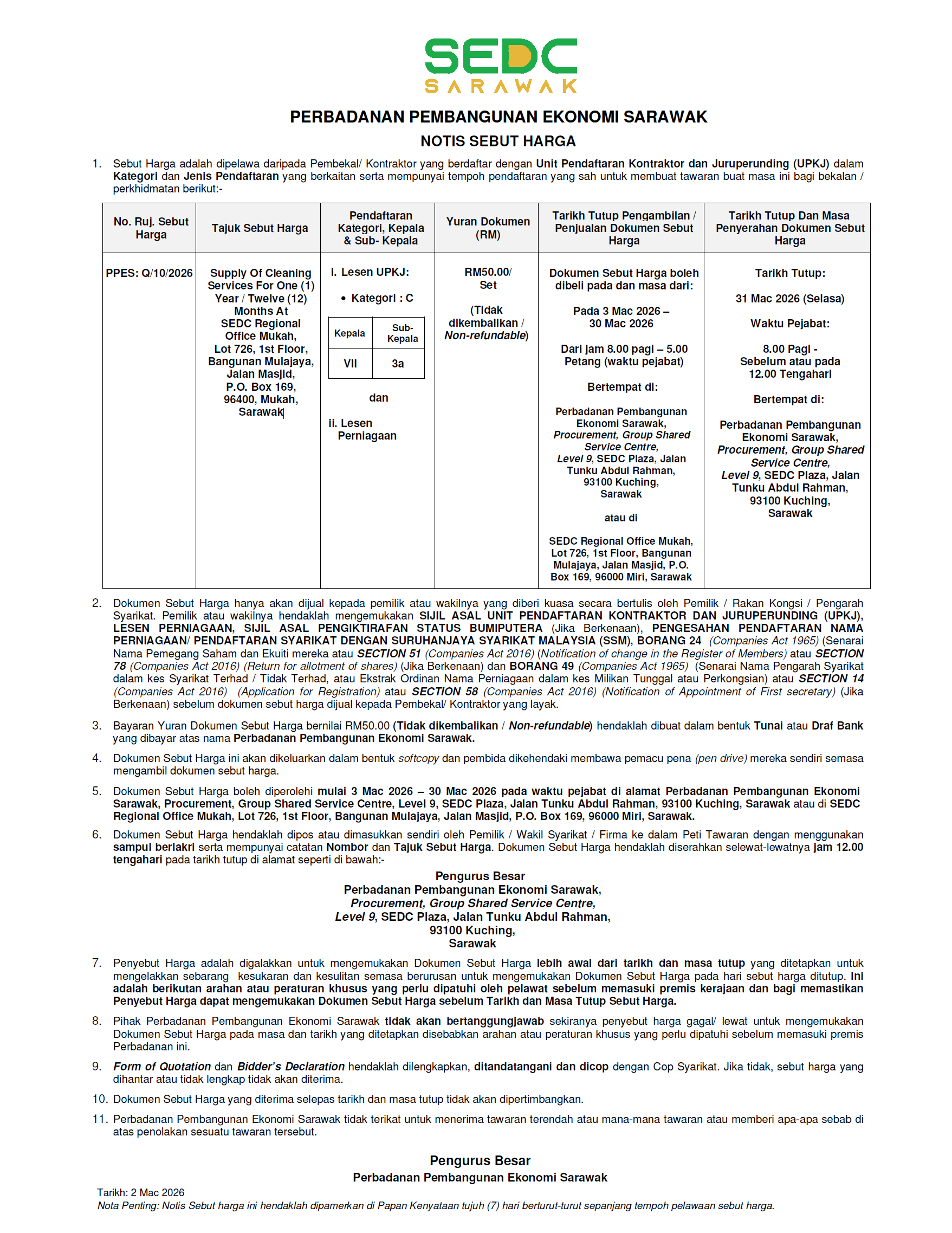 PPES: Q/10/2026 – Supply Of Cleaning Services For One (1) Year / Twelve (12) Months At SEDC Regional Office Mukah, Lot 726, 1st Floor, Bangunan Mulajaya, Jalan Masjid, P.O. Box 169, 96400, Mukah, Sarawak