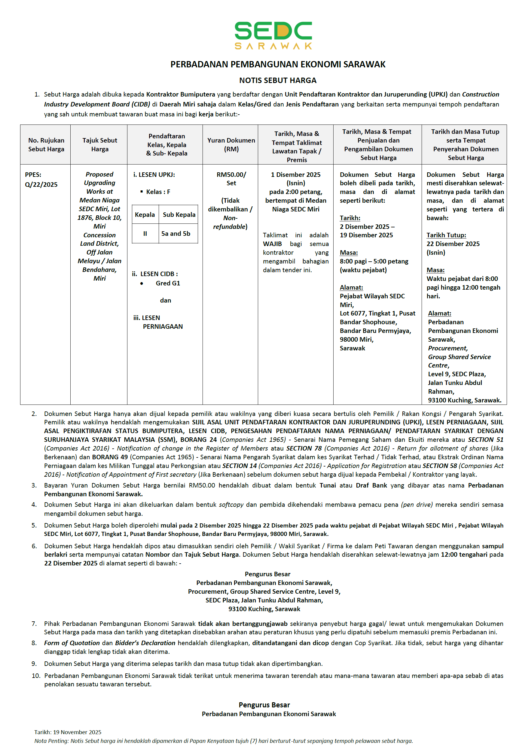 PPES: Q/22/2025 – Proposed Upgrading Works at Medan Niaga SEDC Miri, Lot 1876, Block 10, Miri Concession Land District, Off Jalan Melayu / Jalan Bendahara, Miri